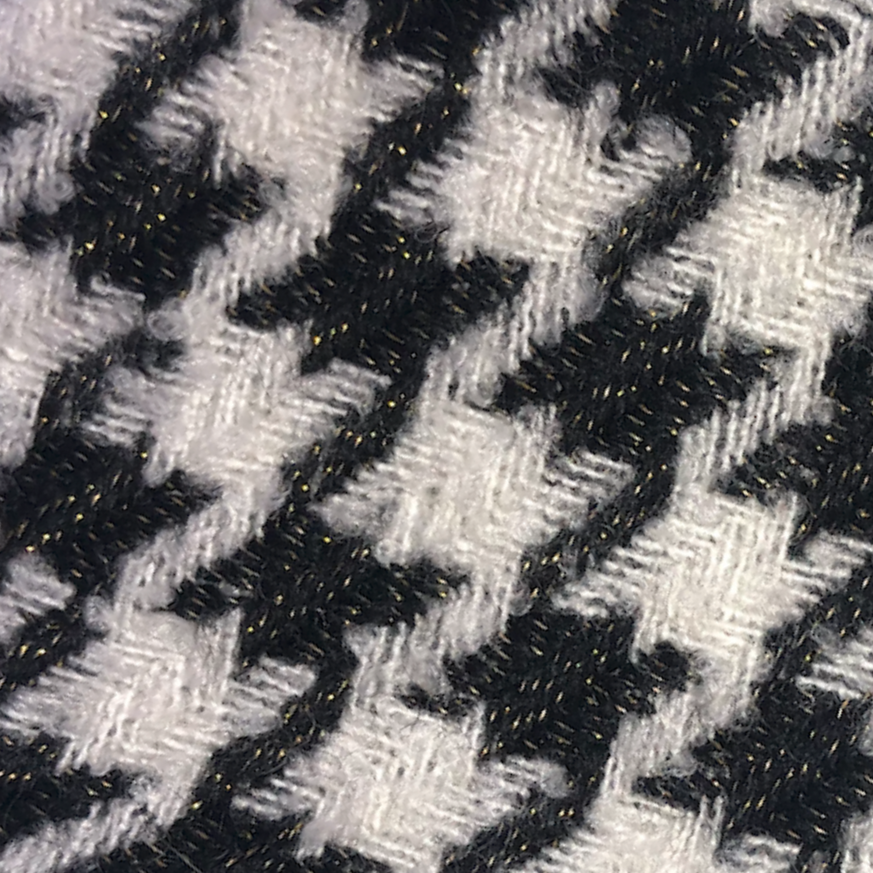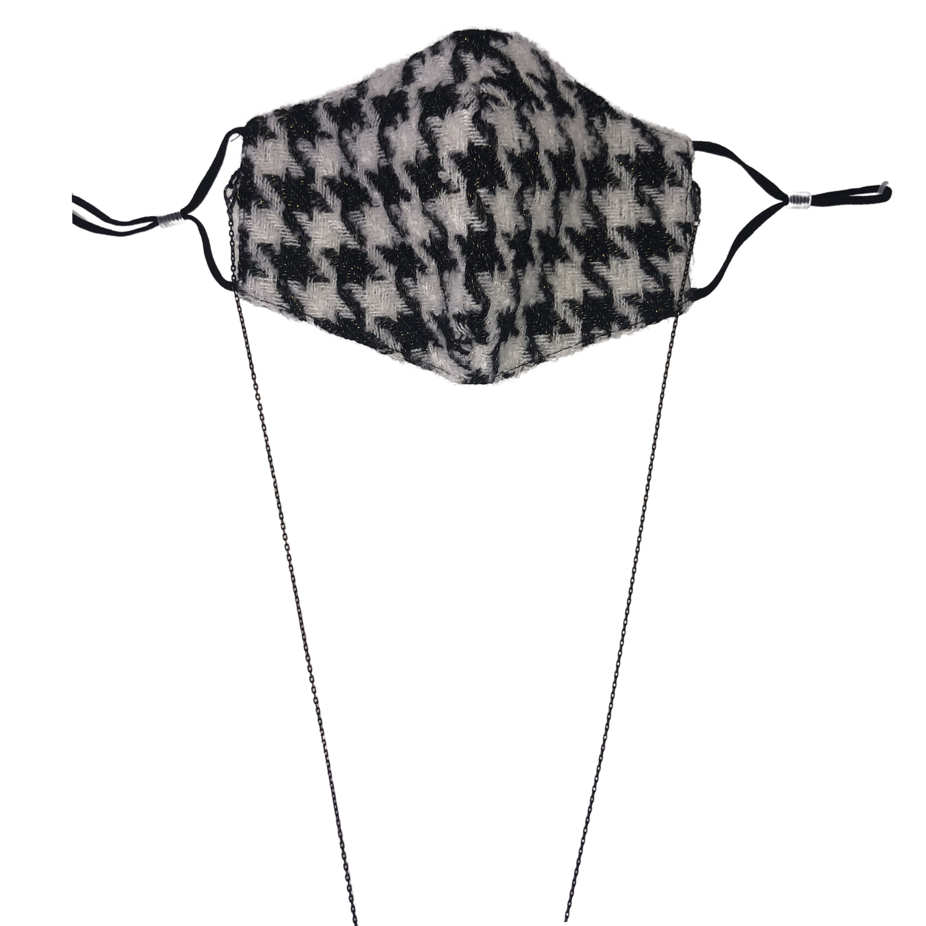 The Riki Mask, houndstooth  from High Quality Reusable 3 Layered Matte Wool Cloth Mask Black with Black Gold Accented Chain Lanyard matches effortlessly with just about everything you want to wear. Built in sleeve for our removable filters.
